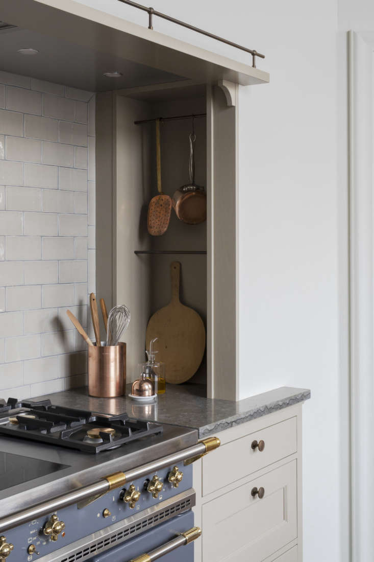 Above: One side niche is detailed with shelves, and the other, shown here, has bars for hanging cooking tools. The range vent is finished with a manor house-style flourish: a narrow wood ledge and bronze rail.