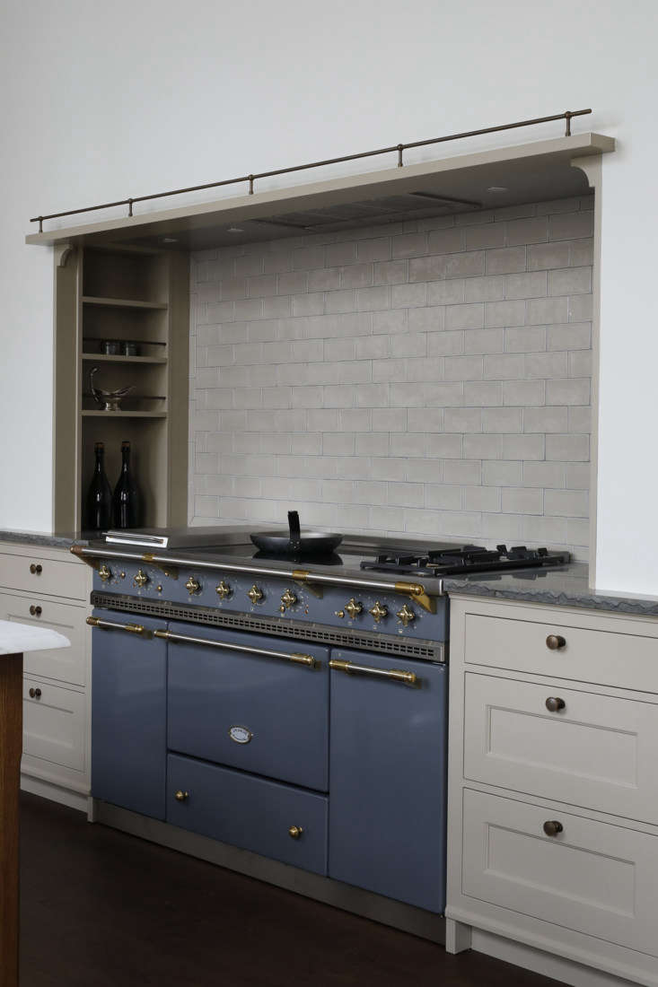 Above: A Lacanche range is set in the tiled niche and flanked by drawers with bronze knobs and limestone counters.