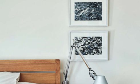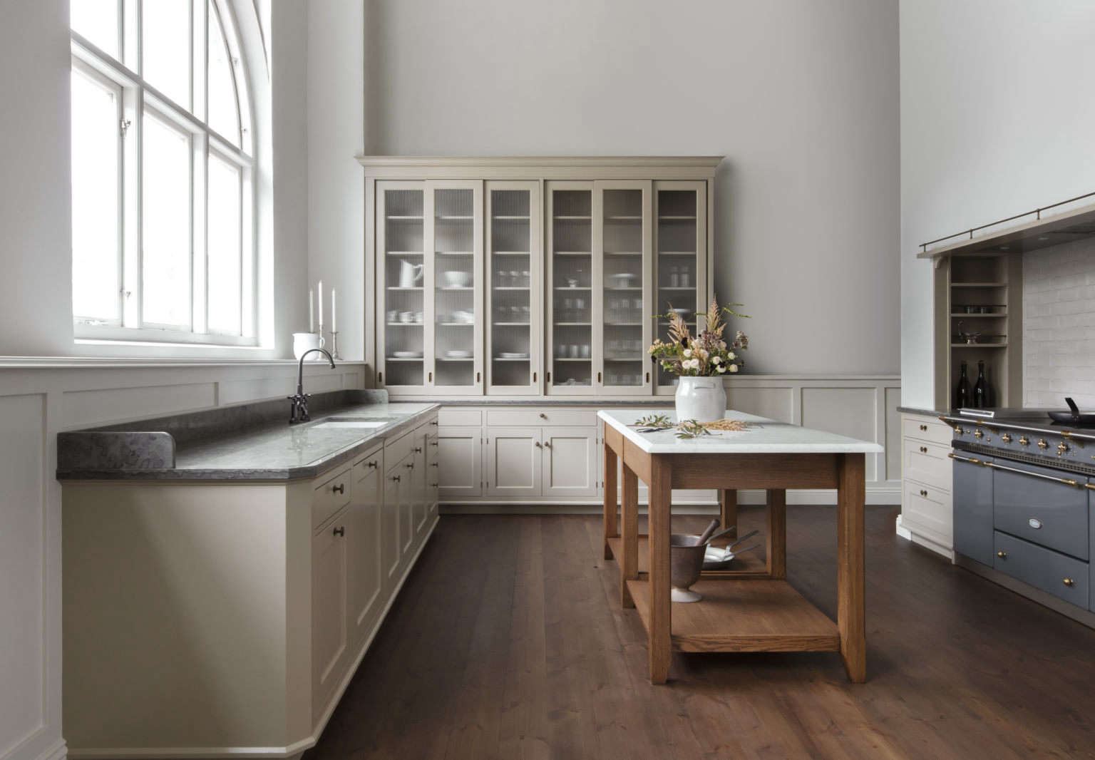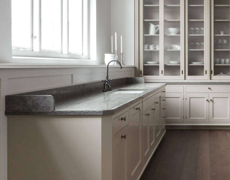 Above: The company ‘s kitchens are made to order using traditional woodworking techniques: the recessed cabinet doors are made of painted ash in a color Kvänum calls Almond and have a “subtle double pearl” on the inner frame. The cabinets and sink counter, of gray limestone from Sweden’s Mount Kinnekulle, have angled corners, an elegant and also practical detail—a lack of sharp edges helps prevent bruised hips.,