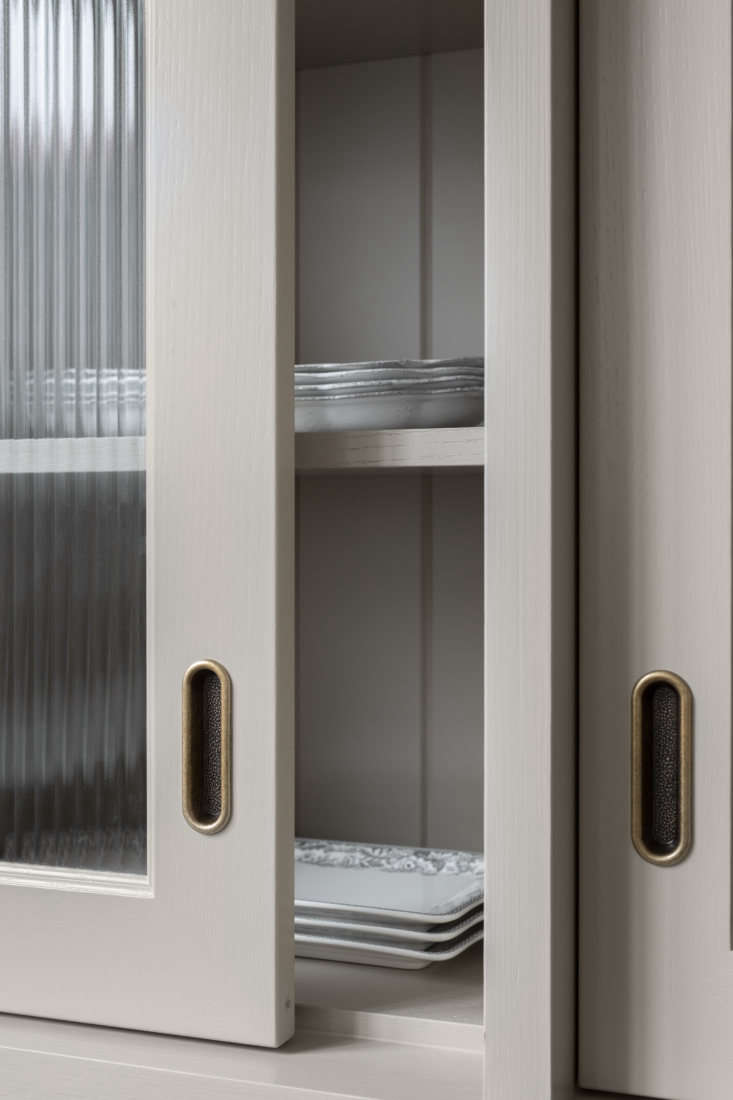 Above: The cabinet is detailed with reeded glass and sliding doors with recessed bronze handles. Note the paneled interior. It’s lit  by hidden LED lighting.