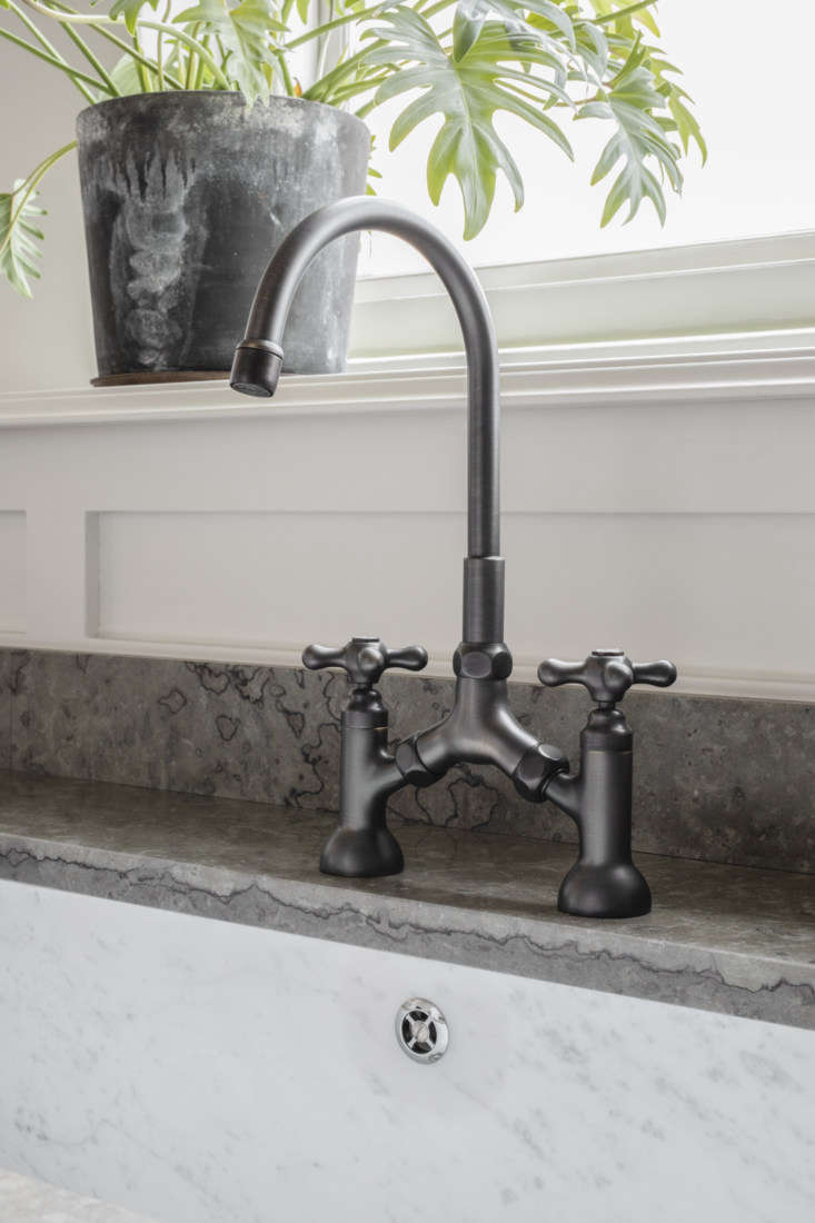 Above: The bridge faucet is the Roma, made for Kvänum by Stella of Italy. It’s shown here in a decidedly modern dark bronze—brass is also available—paired with a Carrara marble sink.