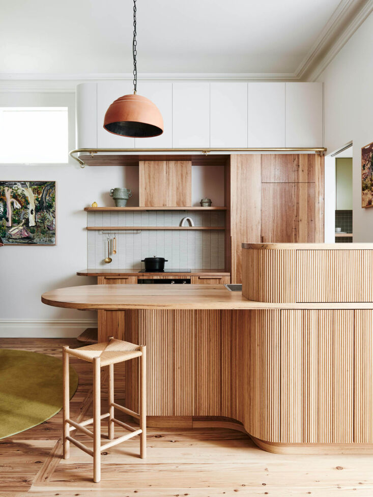 Above: The curved island is faced with half dowels of Tasmanian oak and has a counter of recycled messmate, an Australian hardwood.
