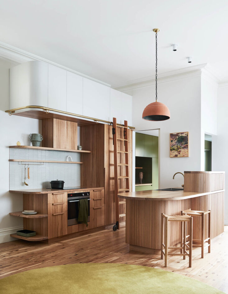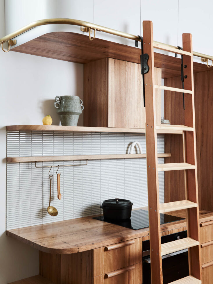 Above: The upper kitchen cabinets—for items that aren’t in daily use—are accessed by a library ladder that slides on a brass rail. The lower cabinets have a veneer of  Eucalyptus Pilularis, also known as blackbutt. Kim got the sisters to “improve their eco credentials” by replacing their gas range with a Fisher & Paykel induction cooktop and electric oven. The backsplash mosaic tiles are Inax’s Yohen Border design from Artedomus.