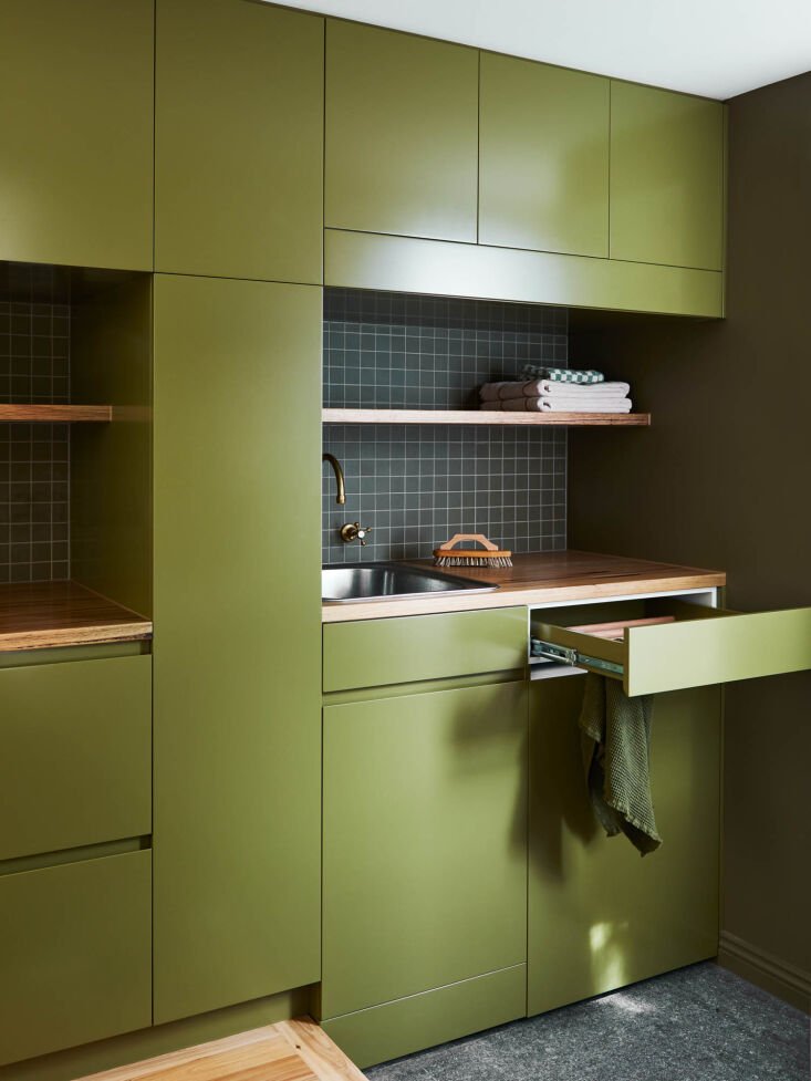 Above:  The combination pantry and laundry room is tricked out with streamlined storage in a verdant green. The cabinets have a “2-pac” finish that looks like laminate but is actually akin to car paint (read about it here) ; the counters are recycled wood.