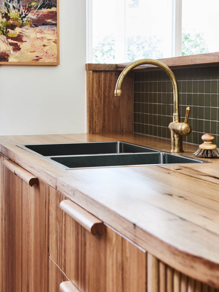 Above: The made-in-Australia brass faucet is from Consolidated Brass Tapware. The painting is by Rohan Fraser. See more kitchens with art on display in our Trend Alert.