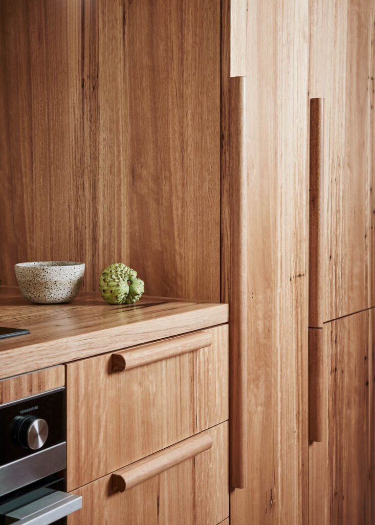 Five years passed before she heard again from the sisters: they had just learned they weren’t going to lose their house after all—and were ready to move ahead. At the time, Kim and her team were neck deep in projects for the Peninsula Hot Springs, a spa resort—”I wasn’t even available to meet with them for another 18 months.” They waited and Kim returned. Using the look of those 2013 timber bookshelves as a starting point, she enacted a remarkable space-enhancing, wood-crafted transformation (scroll to the end to see the Before shots). Completed during the pandemic, the project has been celebrated in the Australian design press and well beyond as the little house that could. Here, we’re spotlighting the elegantly orderly, Art-Deco- and Arts and Crafts-inspired kitchen that now serves as command central.