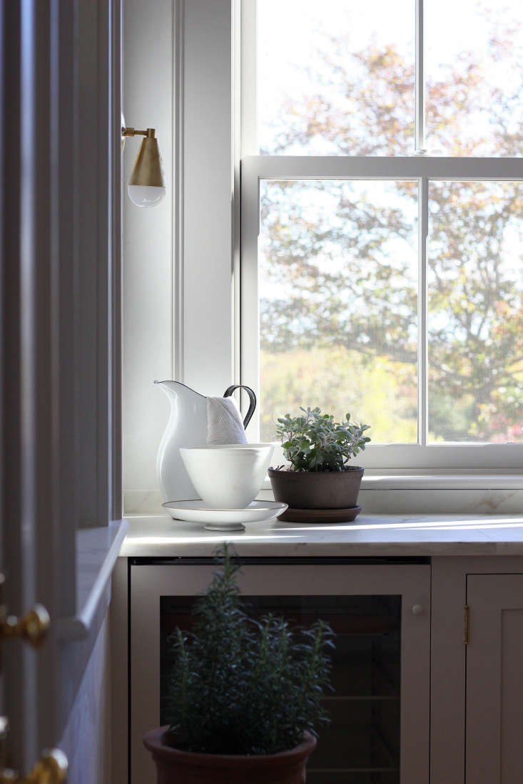Above: The farmhouse sink has a Barber Wilsons Bridgemaster Faucet in unlacquered brass. The counters are honed Crema Delicato marble. Tara found the house’s scalloped terracotta planters at a local nursery. Photograph by Jersey Ice Cream Co.
