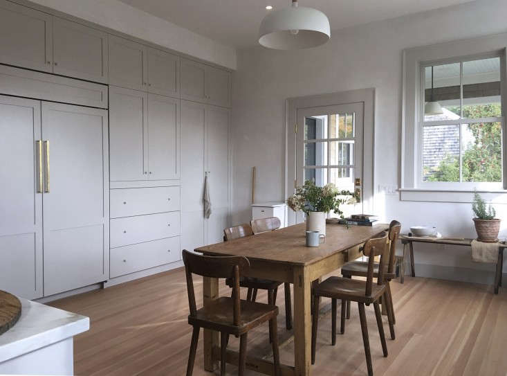 Above: The house’s original contractor, Jay Fischer of Cold Mountain Builders, built the kitchen cabinets. They’re painted Benjamin Moore’s Balboa Mist, as is the trim. Photograph by Sal Taylor Kydd.