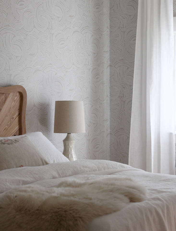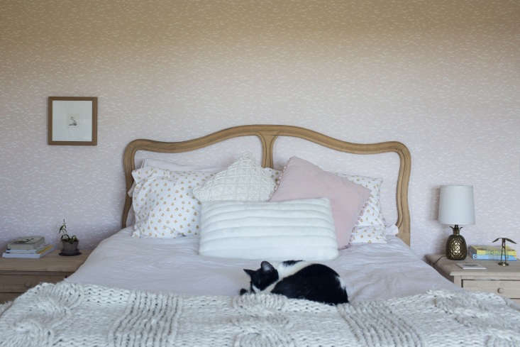 Above: The guest room is patterned in a Farrow & Ball wallpaper called Tourbillon. The bedding is from Parachute (see Eat, Pray, Love: Luxury Linens for Less.) Photograph by Jersey Ice Cream Co.