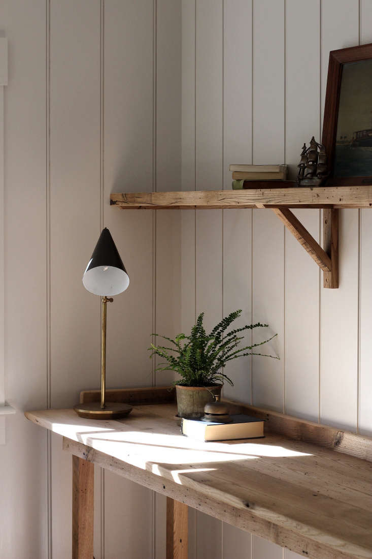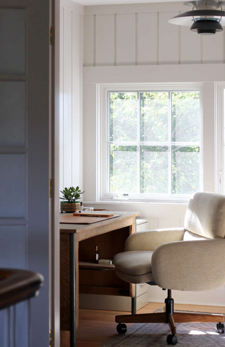 Above L: Sal and Steven both work from home. She took over the existing art studio, and Percy and Tara built Steven a paneled office from a “nothing room” on the second floor of the house. (See their Remodeling 101 Primer on Wood Paneling.) The vintage desk came from Eneby Home of Nashville. Above R: The opposite wall has a standing desk with a shelf: “It’s a sort of garage work bench meets office situation,” says Percy. Photograph by Jersey Ice Cream Co.