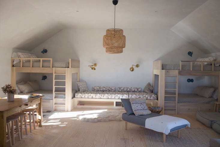 Above: Percy and Tara transformed the space into a bunkhouse with built-in poplar double beds bunks cleverly divided by a lounge. Note the under-the-bed storage. Created for use by the family’s guests, the house is also available on Airbnb for $145 a night. Photograph by Sal Taylor Kydd.