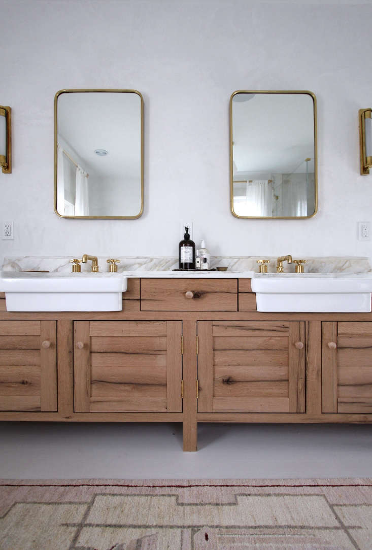 Above: In the main bath, Rejuvenation Metal-Framed Mirrors hang over twin sinks in a custom vanity made by Percy. Photograph by Jersey Ice Cream Co.