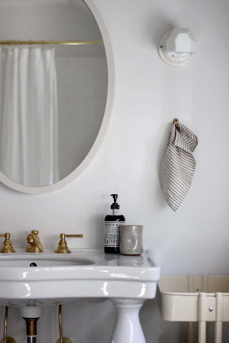 Above: Percy transferred the master bath pedestal sink into the son’s bath and replaced the faucet with a Newport Brass Astor faucet in unlacquered brass. The light is Schoolhouse Electric’s Morris Sconce; a Råskog Utility Cart from Ikea is used for storage. Photograph by Jersey Ice Cream Co.,