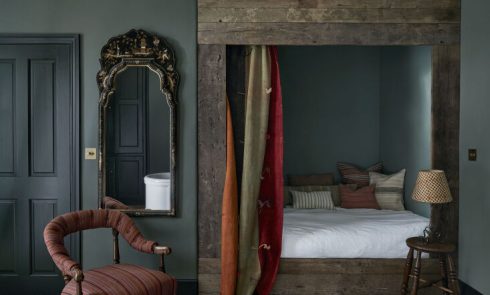 Above: Mandated to create a look of “uncomplicated luxury,” Spiro went to town with textiles. Like the headboards, the walls in the 21 guest rooms are upholstered in ornate fabrics that telegraph vacation. Photograph via Black & Spiro Interior Design.