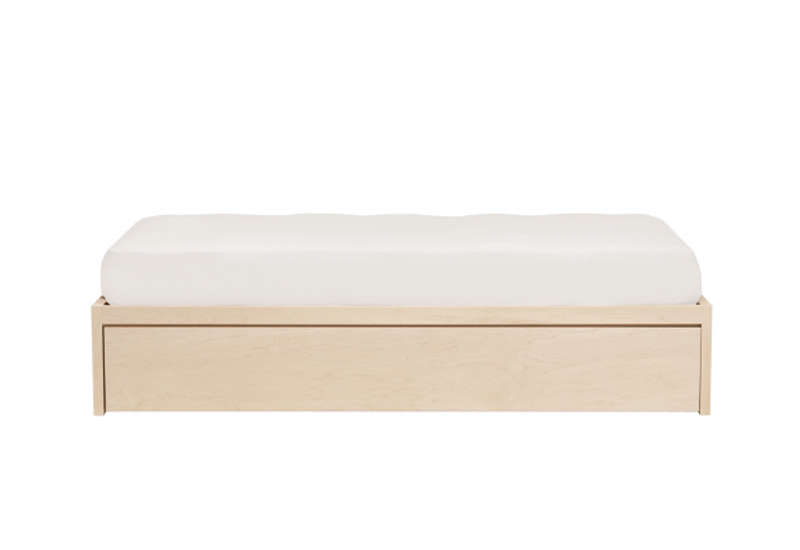 Above: The guest bed is the Thompson Trundle Bed ($1,049) from Urban Green Furniture that has been fashioned as a storage daybed (see our post 10 Design Ideas to Steal from an Über Creative Remodel by Studio Oink for what’s stored underneath). The trundle bed was painted Farrow & Ball Slipper Satin to match the walls.