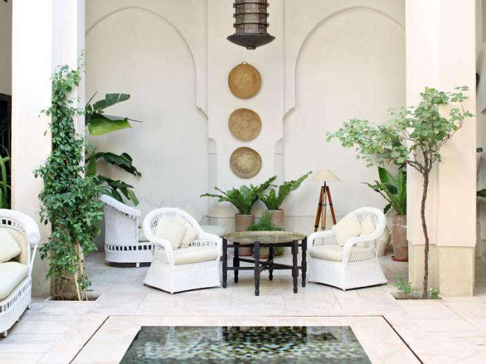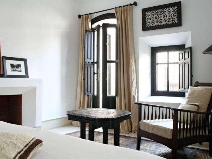 Among the details we admire: the marble bathrooms; the pool tiled in a mosaic of brown, black, white tiles; and the handmade furniture throughout the interior. Go to Riad Dixneuf la Ksor for more information.