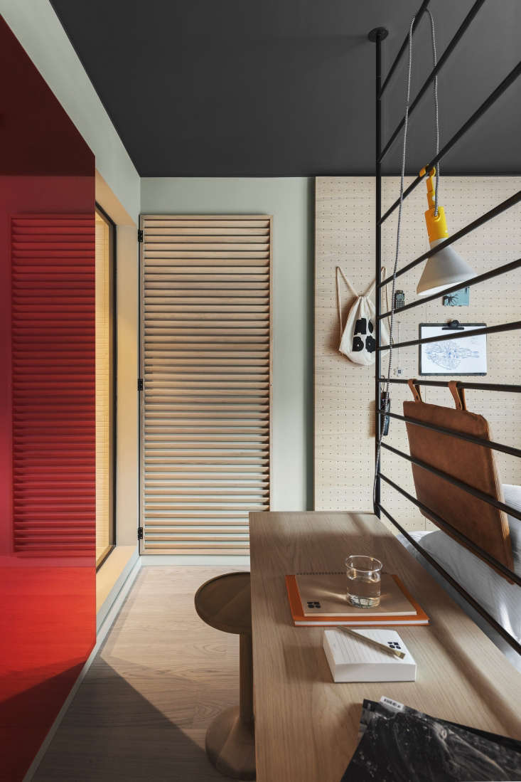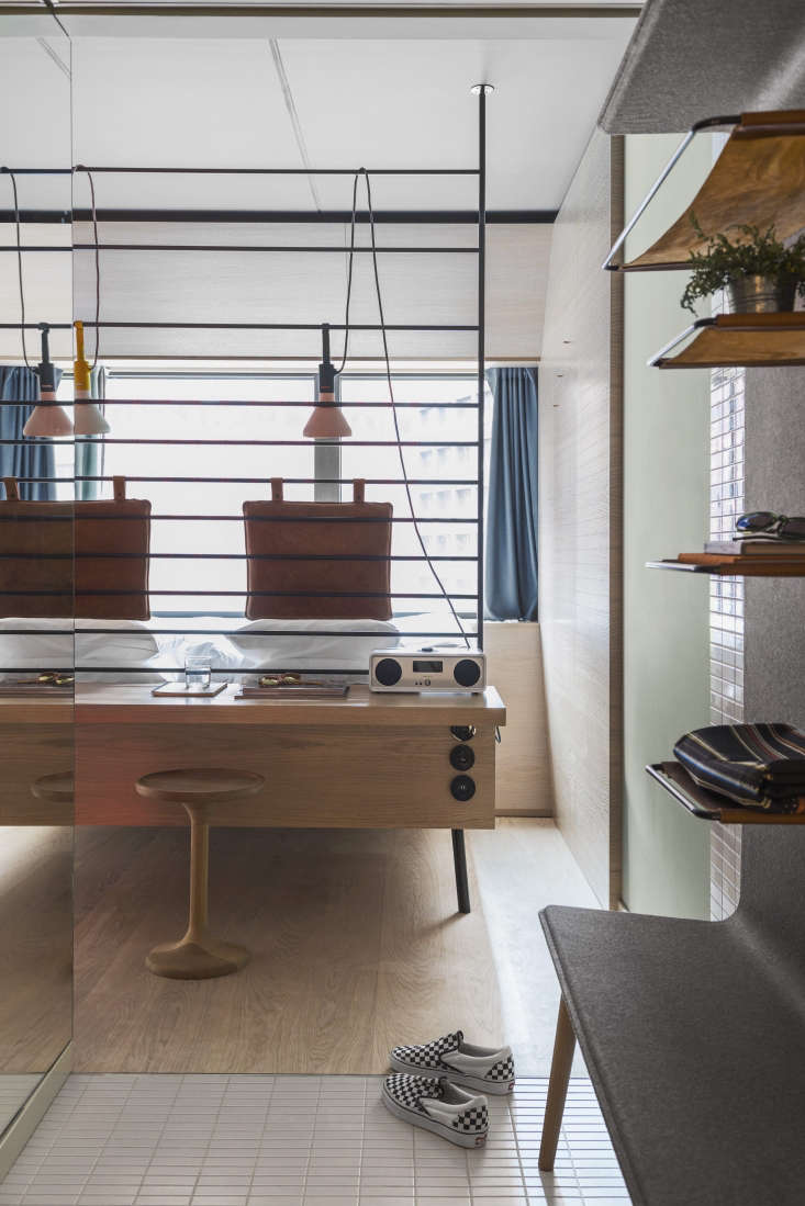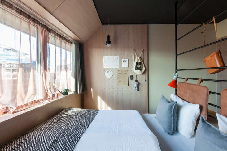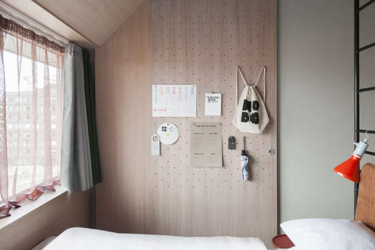 Above: Deployed at the Hobo in range of ways, including as vertical paneling, pegboards also provide a place to display schedules, artwork, tips guests can leave for the next occupants, and hotel accessories (a backpack, umbrella, and pocket synthesizer for use during their stay and to buy if they wish).