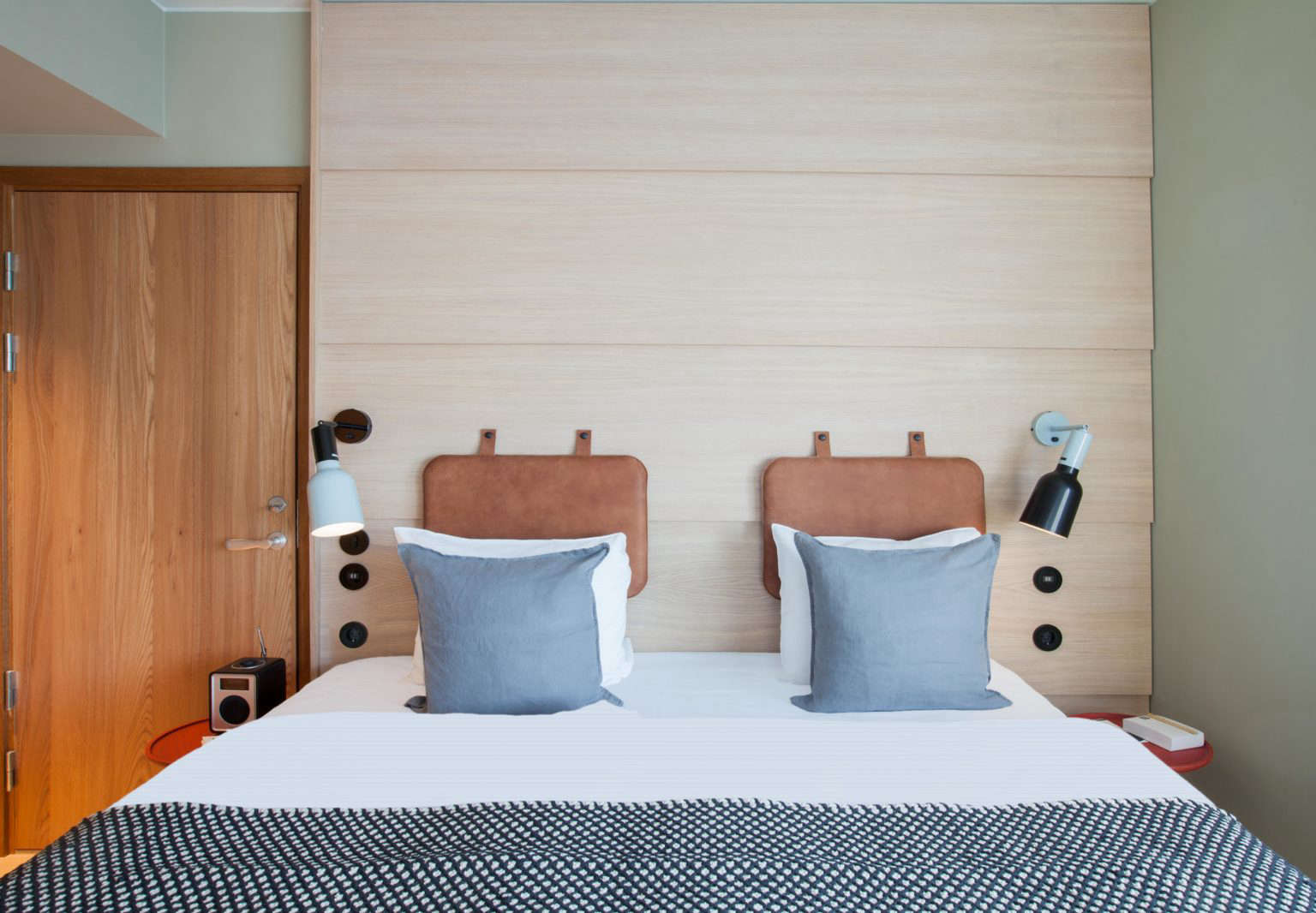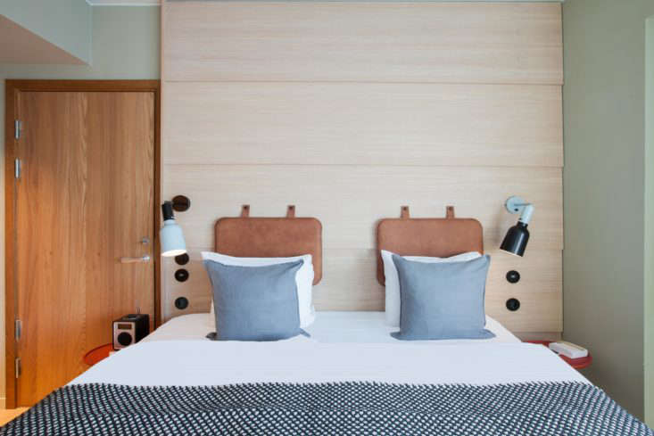 Above: The desk-fronted beds are custom Studio Aisslinger designs. So is the hotel lighting; it’s now in production by Wästberg as the Hobo Lamp Family. Photograph by Erik Lefvander.