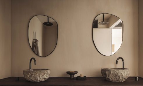 Above: Introducing mirrors is an age-old way to create the illusion of extra square footage. Studio Aisslinger added a surprise touch: a rose-colored mirror that contrasts with the pale green-gray walls.,