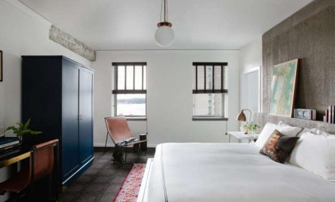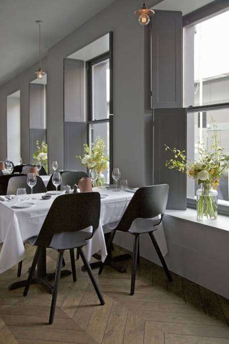 Above: The small Post-Supper Rooms “remove the need for a taxi home after dinner” and feature Shaker-pegged lined guestroom. Rooms are small and spare and outfitted with design classics (Aalto stools, Bestlite lighting).