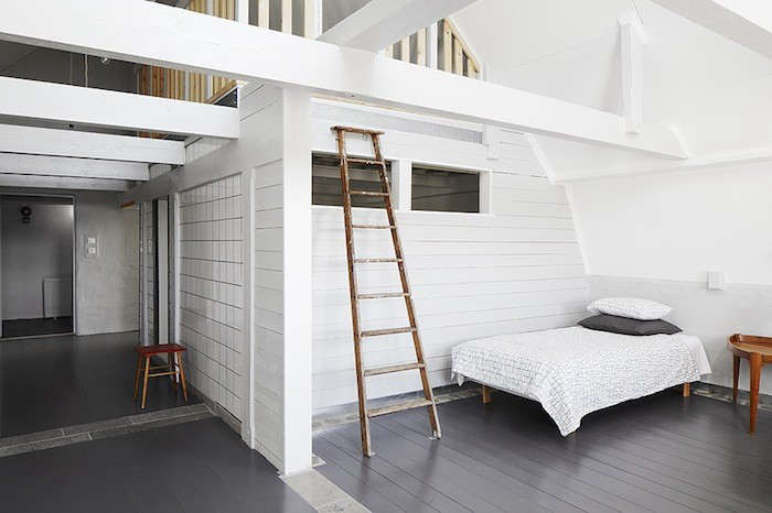 Above: The walls and ceiling of this lofty bedroom are covered in white painted shiplap paneling. (See Expert Advice: The Enduring Appeal of Shiplap.),