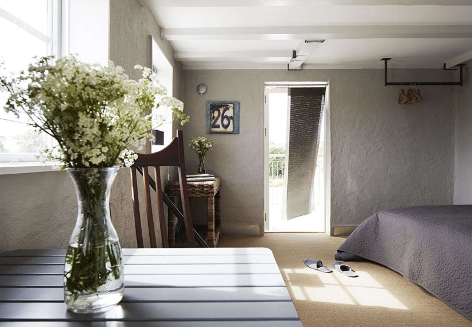 Above: A minimalist white bedroom with two twin beds.