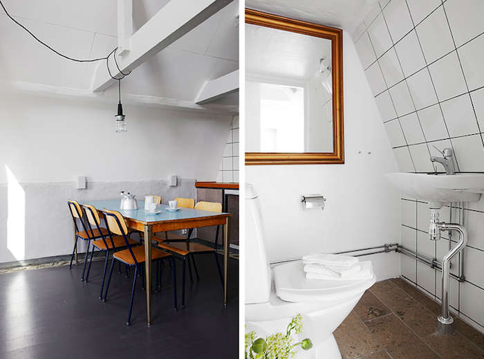 Above L: A dining area in one of the rooms. Above R: A white tiled bathroom.