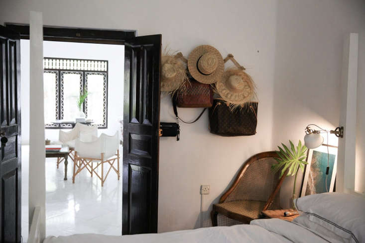 Above: Our favorite of the guest rooms calls to mind a domestic portrait by Danish master Vilhelm Hammershoi (see A Culinary Space Inspired by a Painting). The accordion hanging rack, Linn tells us, is sold locally in roadside stalls for about $4.