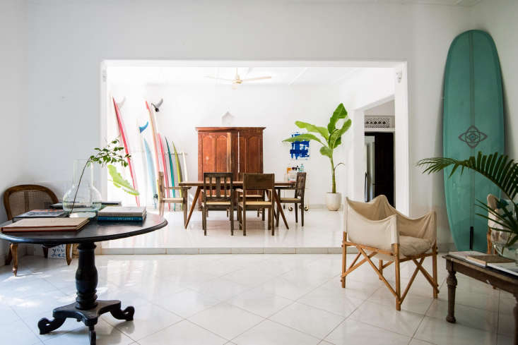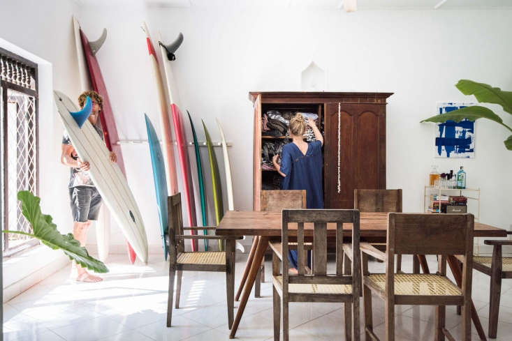 Above: The villa is built around a grassy courtyard with a frangipani tree and has open-air dining and living areas. Guests come from all over the world to take part in weeklong stays of organized classes and lessons. A typical day begins at 6 a.m. with yoga on the lawn “as the sun rises and monks chant in the neighboring temple.” After a communal breakfast—healthy eating is another Sunshine Stories draw—the surfing begins.