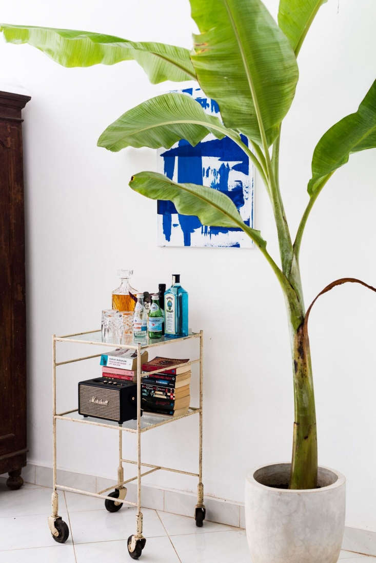 Above: Next to a banana palm, a vintage hospital table purchased at a junkyard serves as a drinks cart. “We love marking the end of a hot day by making G&Ts; it’s a tradition my grandfather started when he visited us,” says Linn.