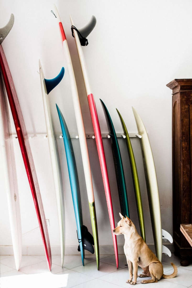 Above: Where to store the surfboards? Linn and Petter’s quiver of Bing boards (all made in California) hold pride of place in the dining room.