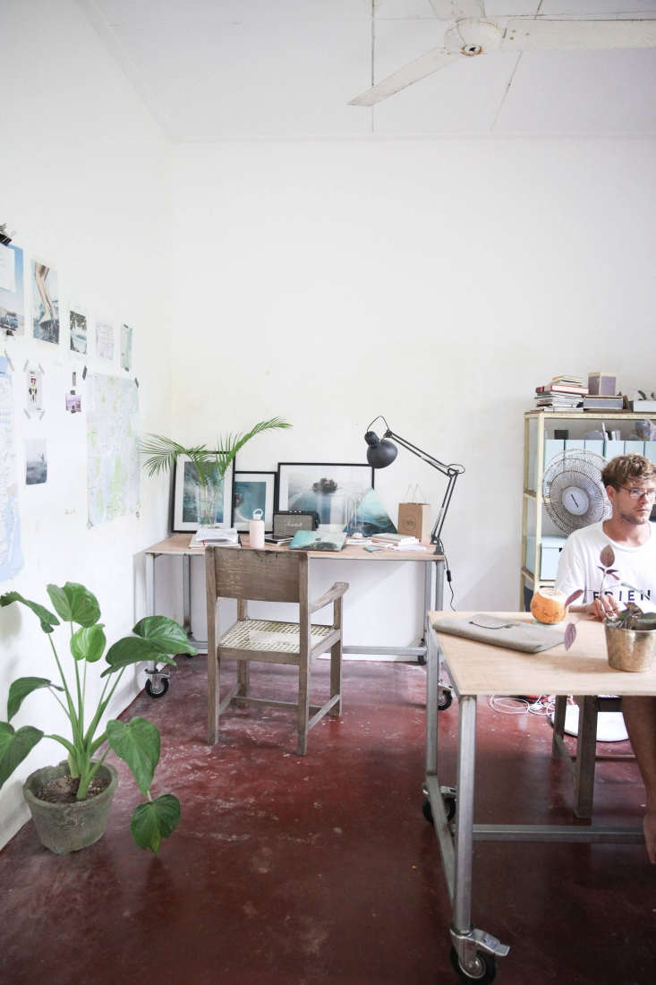 Above: Petter designed the office’s metal-and-wood rolling desks and had them fabricated by a local carpenter and welder. The chairs were rescued from the dump and given new caned seats. Photograph by Linn Lundgren.