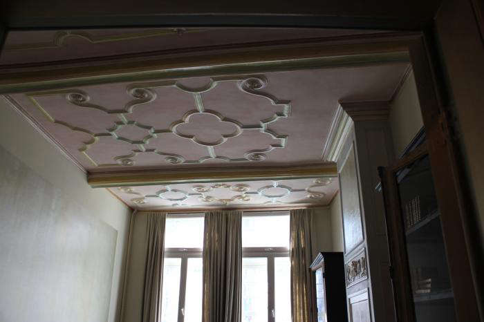Above: Original ceiling details stand out against a wash of pale pink paint.