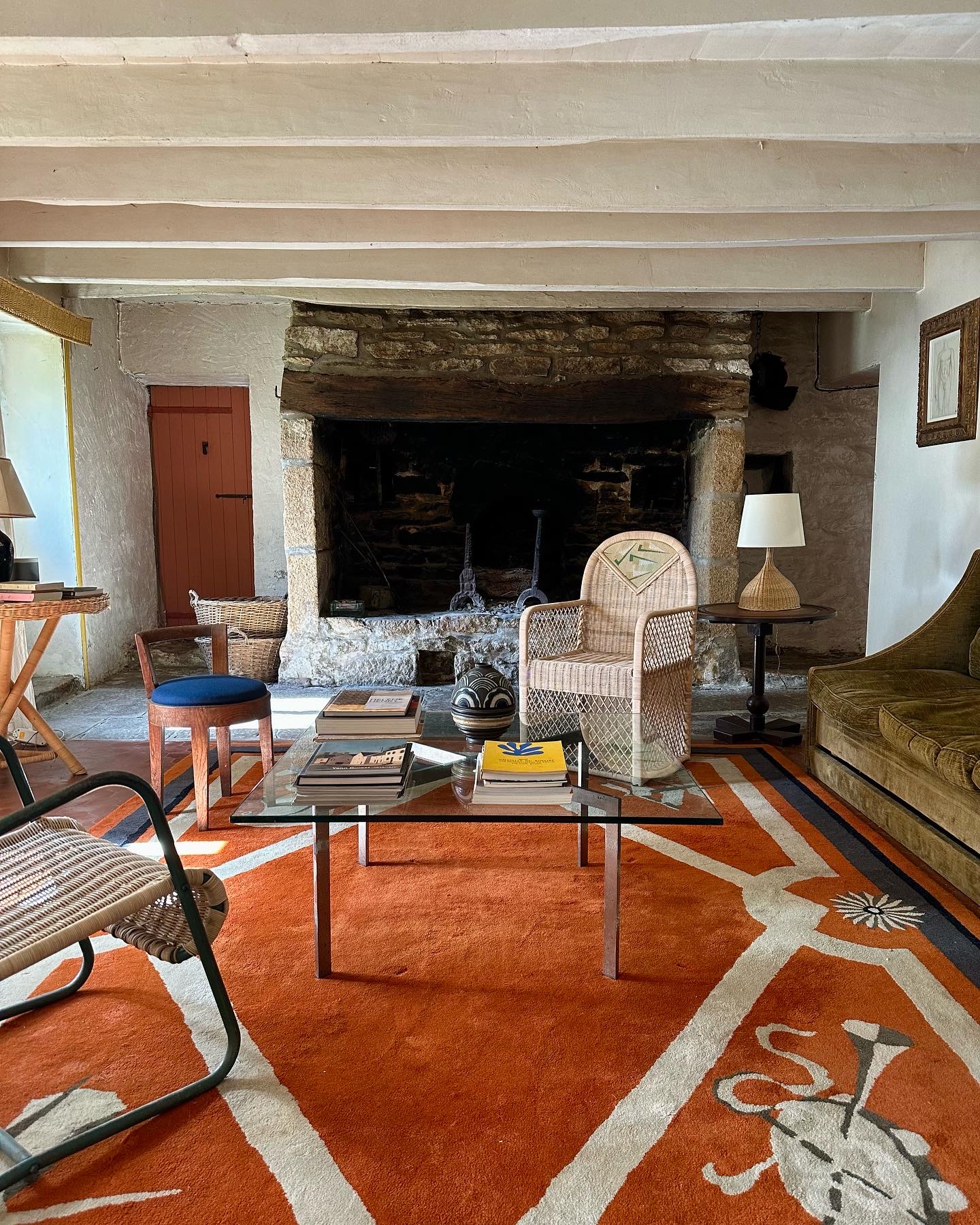 Above: The house is the rustic counterpart to the couple’s high-style place in Provence. Benoît’s father, Jacques, restored the original hearth and added the Mies van der Rohe Barcelona table. It’s now joined by recent additions, including an André Arbus Art Deco rug, and Atelier Vime Editions’ Paquebot Armchair, LP Lamp, and Rattan Pelmet.