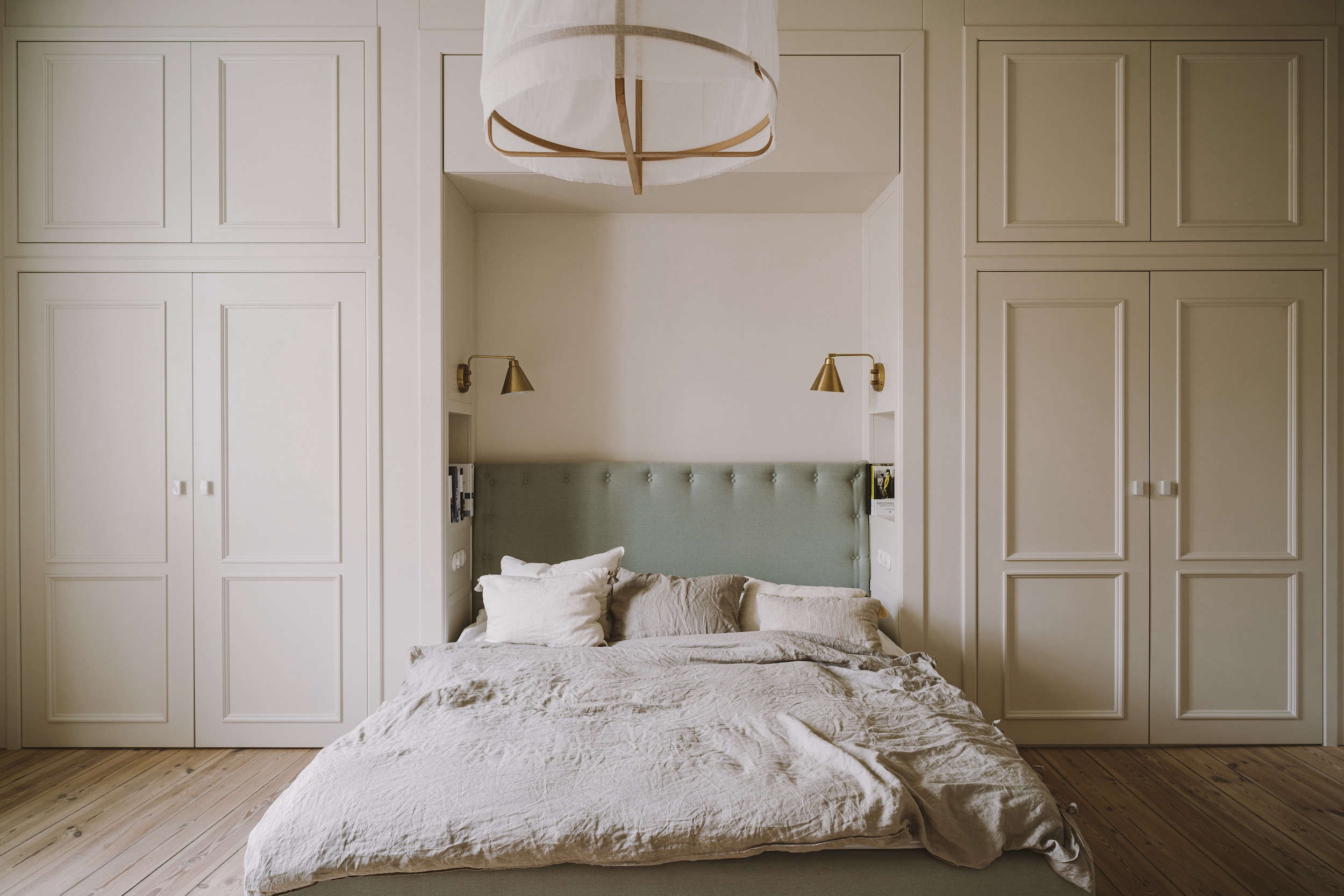 Above: One wall is fully equipped with storage closets, between which is a bed alcove. Photography by Pion Studio, courtesy of Colombe Design, from Old World Meets Modern: A Casual but Elegant Pre-War Flat on the Baltic Coast.