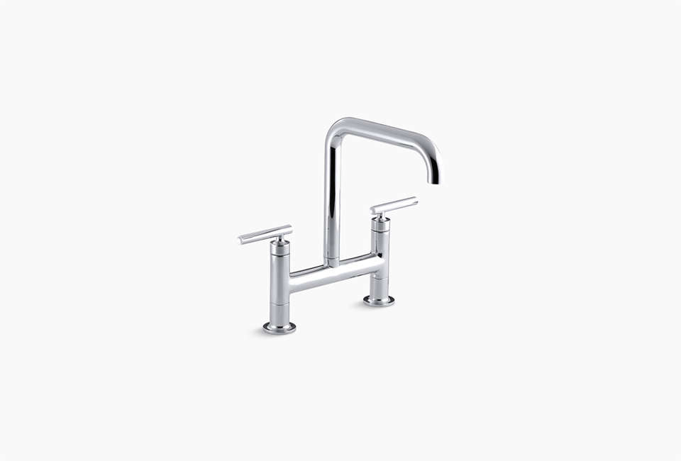 Above: The kitchen sink is the Kohler Purist 12-Inch 2-Handle Deck-Mount High-Arc Bridge Faucet in Polished Chrome; $641.14 at the Home Depot.