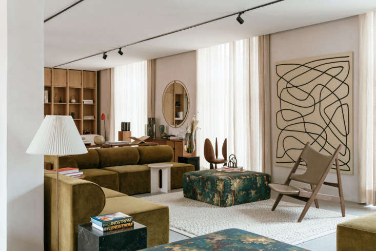 Above: The Menu concept store is set up as living room that gets continually rearranged. The painting is by Portland, Oregon-based artist Benjamin Ewing, one of a small roster of artists whose work is currently on view at the Audo. That’s Menu’s reintroduction of Ib Kofod-Larsen’s modern-classic Knitting Chair in front of the painting.Photograph by Mario Depicolzuane.,