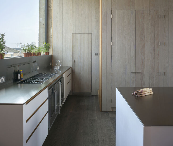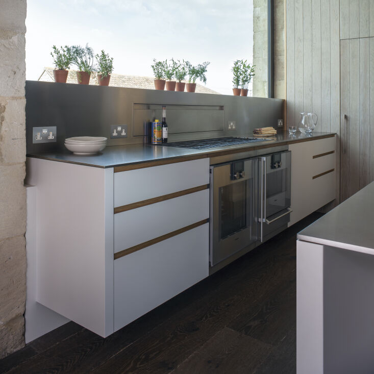 Above: “Particularly satisfying was designing the stainless steel backsplash and upstand that houses the bespoke downdraft extractor and especially the integrated full-length plant trough, designed to be used as a container for herbs.” The stovetop is by Barazza, the ovens by Gaggenau.