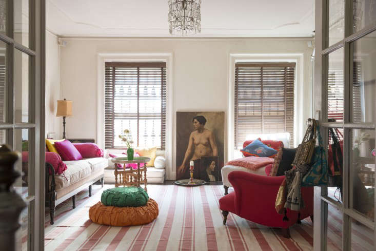 Above: “My apartment is tiny–it’s 500, maybe 600 square feet,” says Alayne. She overhauled the railroad flat herself after striking a deal with her landlord: “The place had all of its original details but it was in terrible shape. I got him to give me a month’s free rent and allow me to redo it as I wanted.” In the sitting room, that involved restoring the wood floor and tin ceiling.