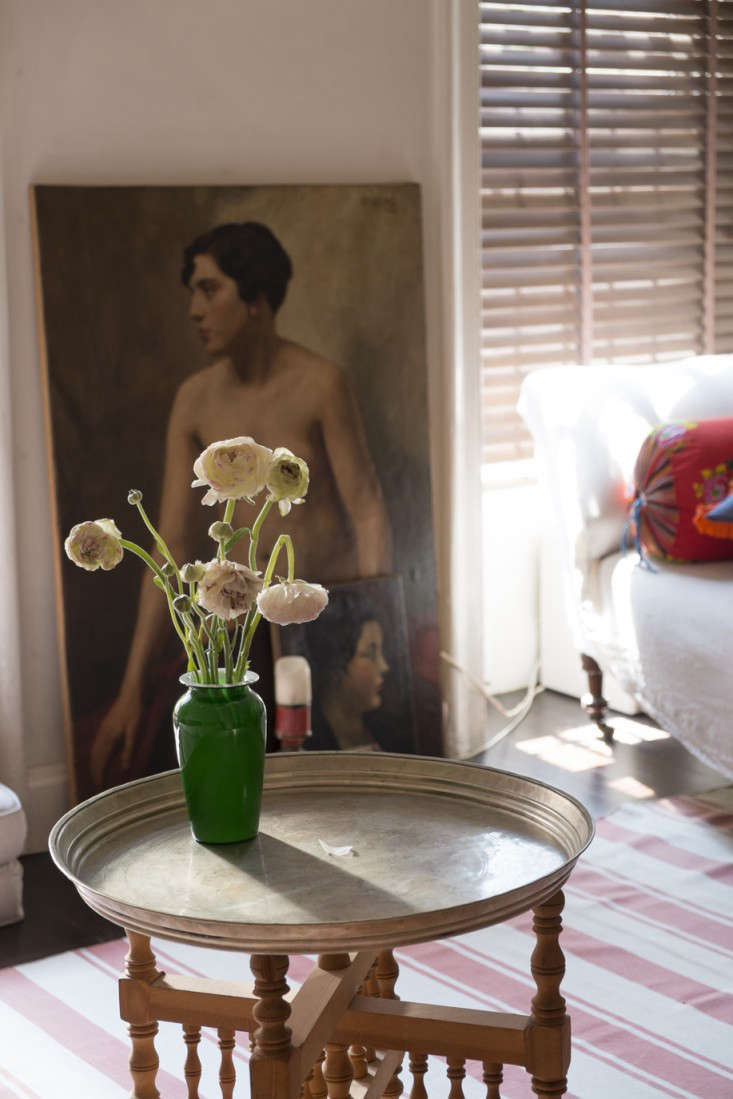Above: The portrait that anchors the living room is a long-ago flea market find likely painted in Eastern Europe in the 1910s, she says. The tray came from John Derian, and the wooden base is from a stand in the Chelsea Food Market. Alayne had the dhurrie made in Delhi on her first trip.