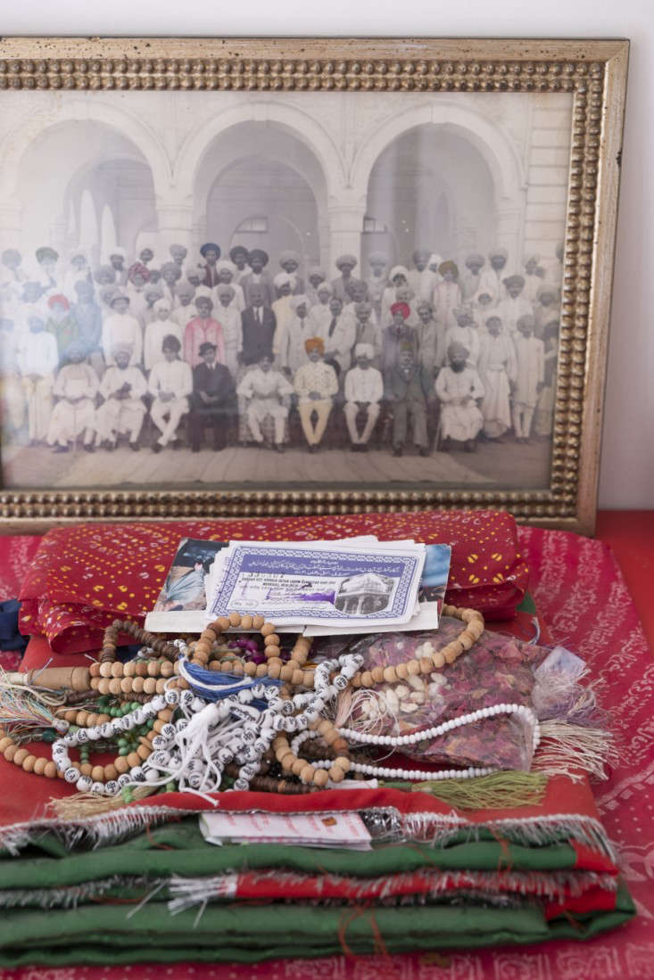 Above: The lacquered cabinet holds prayer beads and blessed fabric from visits to holy sites in India. The vintage group photo is a piece by Alexander Gorlizki, another Brooklyn (and Jaipur) artist friend who specializes in his own version of Indian miniatures (in this example, he inserted painted details).