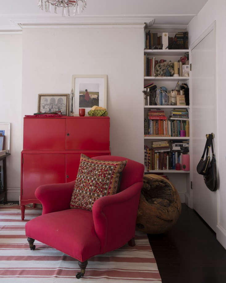 Above: “Pretty much everything fancy in my apartment, like my red George Smith armchair, was a gift,” says Alayne. She pairs it with a vintage cupboard, formerly painted avocado green with flowers: “I had it properly lacquered. I spent a lot on it because and I really needed storage.” She added more storage by inserting shelves in the recessed wall. The curious burl is by Keith Holamon, a Brooklyn artist friend who makes sculptural spheres from found wood.