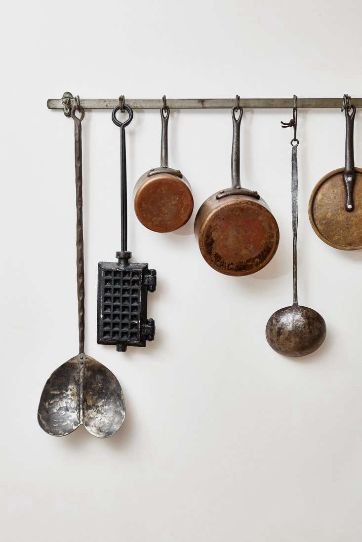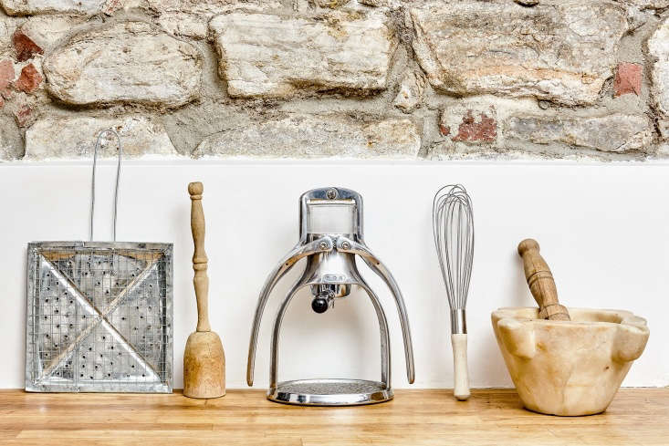 Above: Proof you don’t need an arsenal of high-tech countertop appliances and gadgets: David’s lineup of old-fashioned kitchen implements includes a stainless steel Stovetop Toaster, his grandmother’s potato masher, a Rok Presso Manual Maker, a wooden-handled whisk, and a vintage marble mortar and pestle.