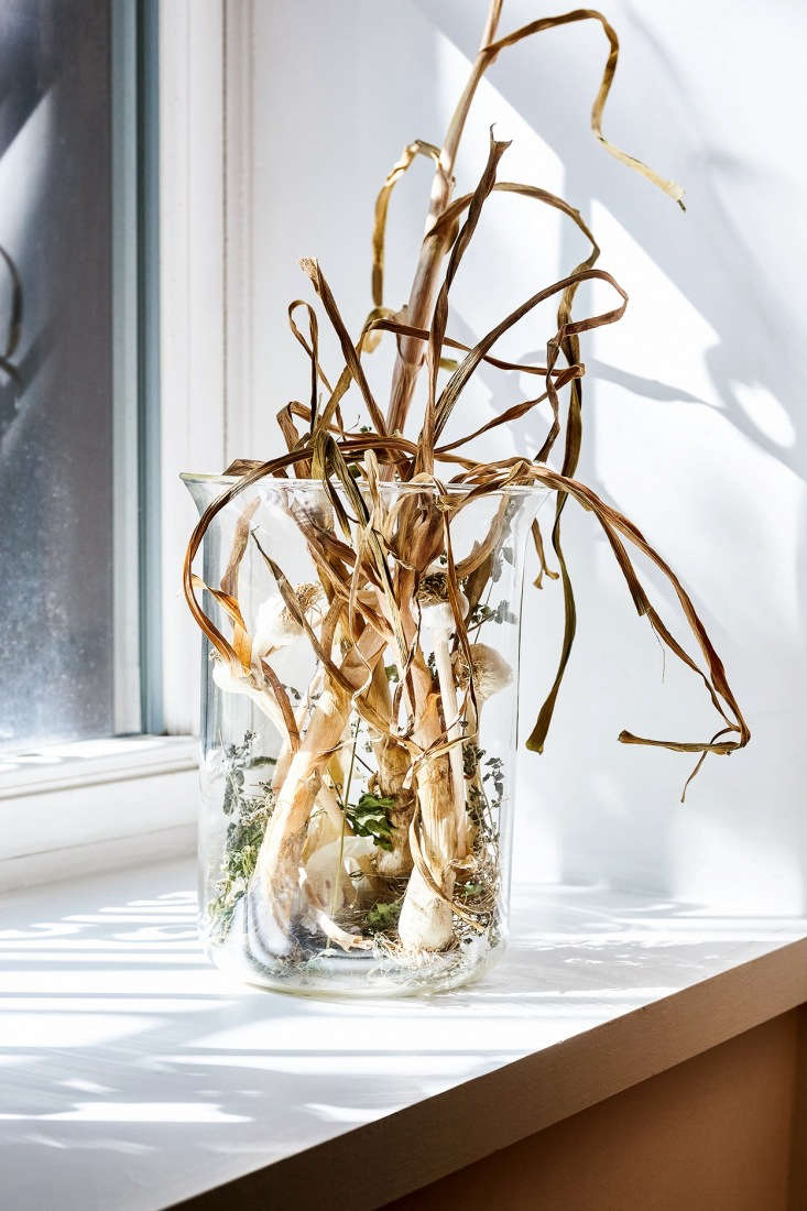 Above: A glass beaker holds garlic from the farmers market.