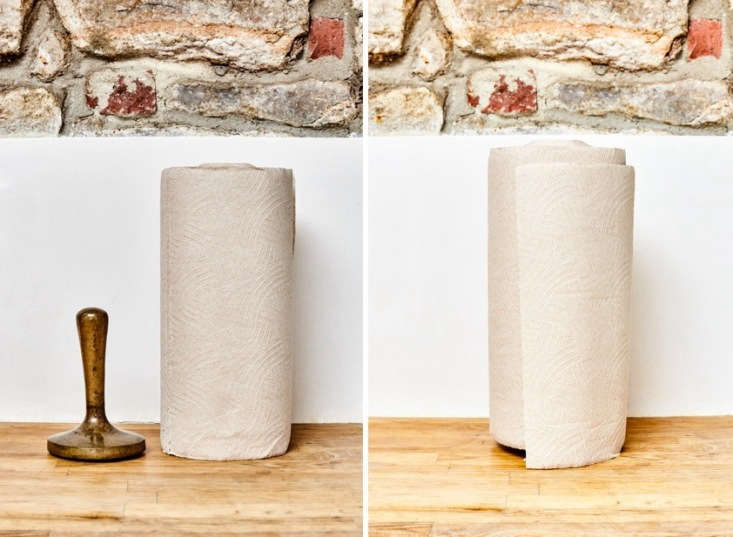 Above: David stores paper towels on a vintage brass meat pounder.