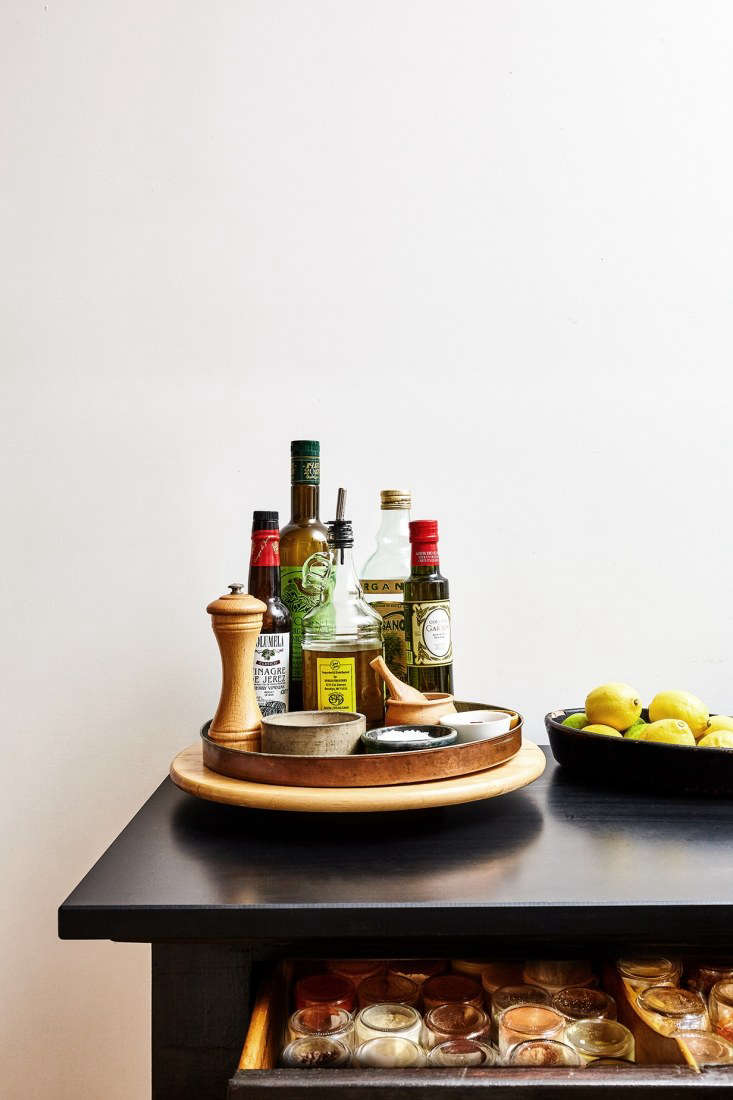 Above: A freestanding vintage Ethan Allen dresser painted black serves as a storage place for spices, linens, and more. A copper tray perched on a lazy susan corrals essentials.
