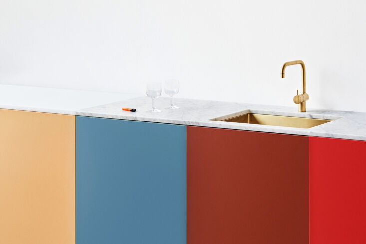 Above: The cabinets are Ikea boxes fronted with vibrant doors from Reform’s Match design by Muller Van Severen. See another kitchen with the Match design in our post Kitchen of the Week: Base Cabinets by Ikea, Chic and Colorful Doors by Reform.