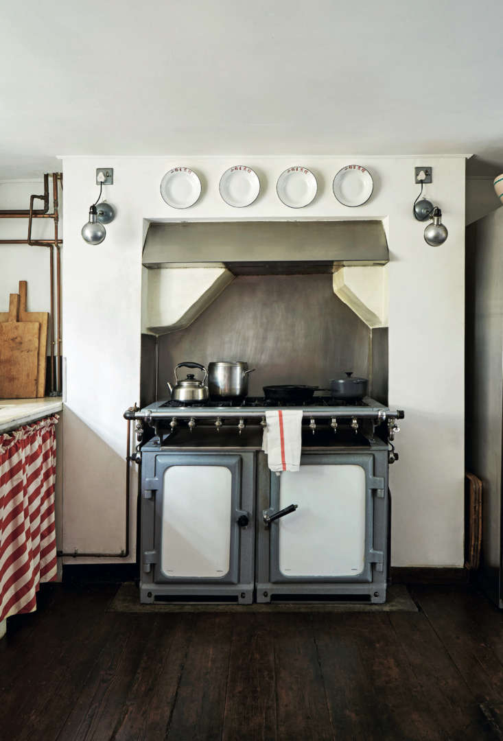 The stove is an industrial Chester Cooker from the 1950s that Baldwin tracked down after shooting Germaine Greer’s house: “She had two of these cookers in tandem looking glorious and sparklingly clean.” Baldwin found theirs—shored up by a former Rolls Royce engineer—in Industrial Exchange & Mart, a magazine devoted to used equipment. “It luckily just fit into the existing open fire space and I had the extract hood made to fit into the actual chimney breast: The fumes go up the chimney.”