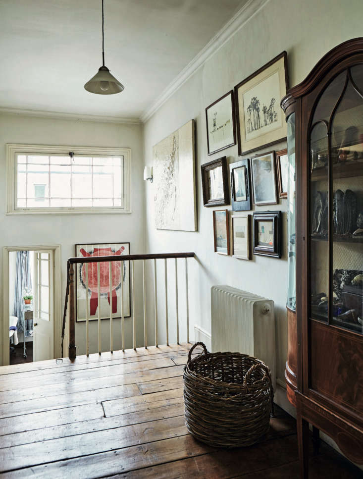 Above: The second-floor landing overlooks a new bathroom added as part of the rebuilt extension—there had been no upstairs bath. The window above it is also a new addition: “This is the wall down which water was pouring when Jan first climbed in to view the house,” notes Byam Shaw.