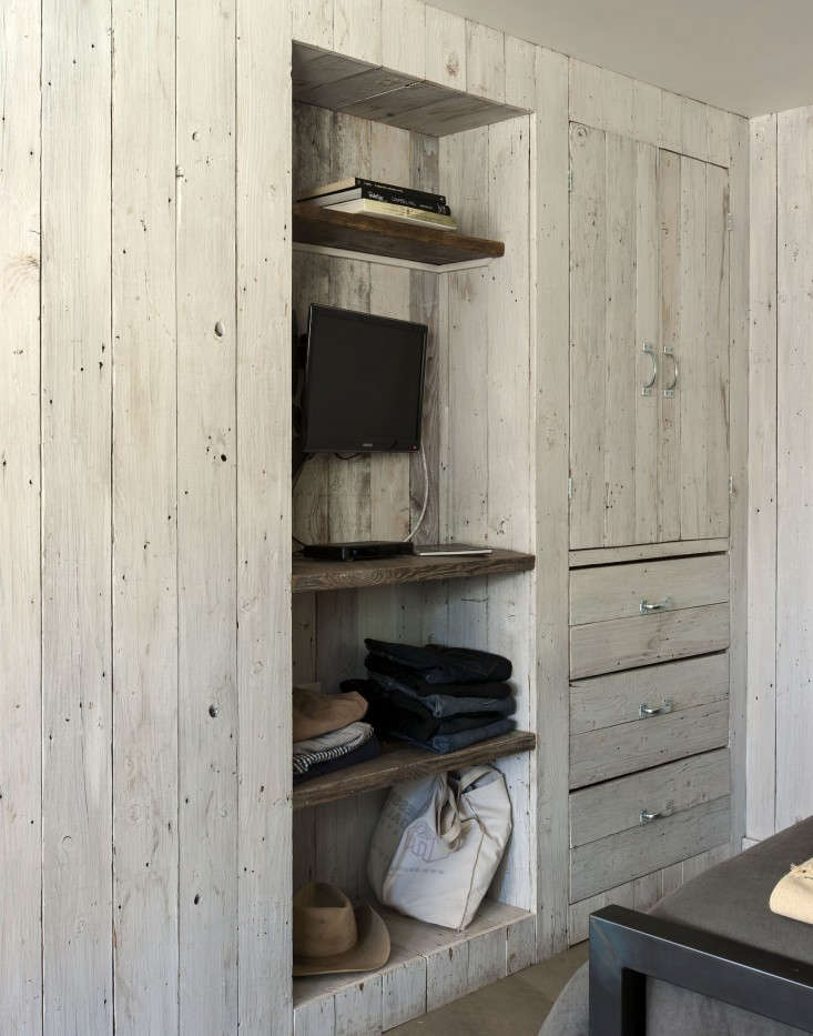 Above: The closets have hardware store aluminum pulls–”$2 each,” says Pays–and are whitewashed inside and out. “We had a great carpenter and painter helping us,” says Pays. “I design; Corbin does all of the drawing to fine detail. He’s good with space; I’m good with colors, textures, and placement.”